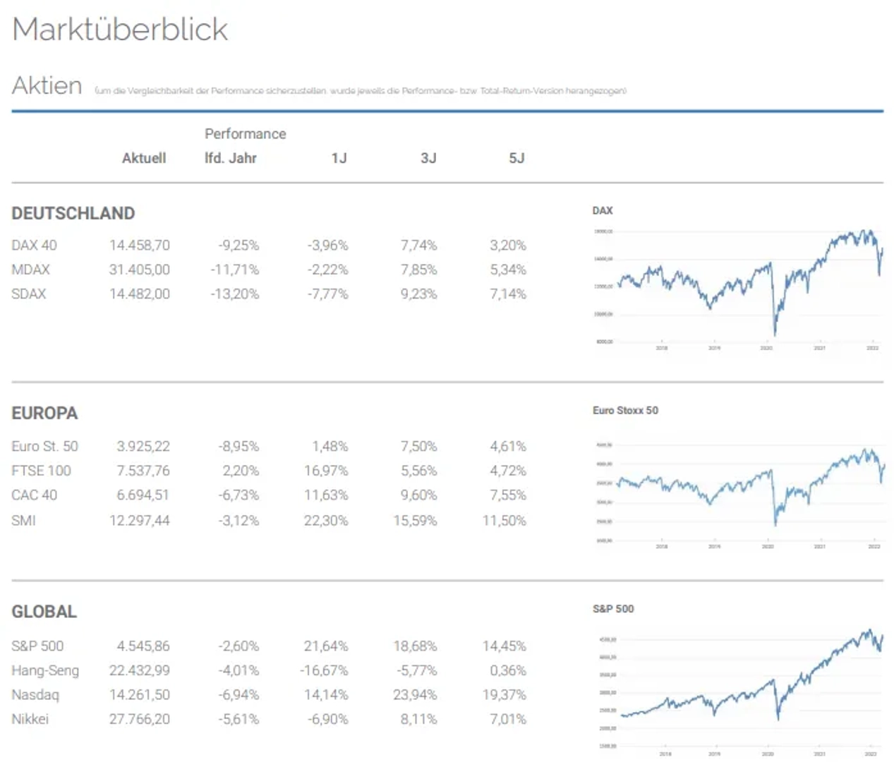 Das erste Quartal 2022 war zweigeteilt. Zu Jahresbeginn dominierte Zuversicht. Der DAX markierte mit 16.271 Punkten am 4. Januar einen historischen Höchstkurs. Ab Februar wurden die geopolitischen Risiken des sich zuspitzenden Ukraine Konflikts bewertet. Der Beginn des Ukrainekriegs am 24. Februar 2022 wirkte sich als Katalysator eines grundsätzlich negativen Sentiments aus. In der Folge kam es zu einem Tiefstkurs des DAX am 8. März bei 12.831 Punkten. In Folge des Konflikts nahm die Zuversicht in der Realwirtschaft, bei Verbrauchern und Finanzmarktteilnehmern markant ab. Dabei spielten die Aspekte Versorgungssicherheit im Rohstoffsektor und Anstieg der Preisinflation als auch damit assoziierte Zinserhöhungen prominente Rollen. Im weiteren Verlauf des Quartals kam es zu einer Stabilisierung an Aktienmärkten, jedoch nicht in der Realwirtschaft und an den Zinsmärkten, die auf Hoffnungen diplomatischer Lösungen basieren. Das Thema Corona-Viren spielte im Quartal eine untergeordnete Rolle.