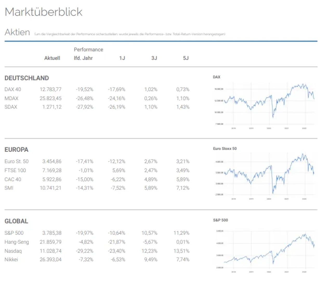 Die Finanzmärkte reagierten im 2. Quartal 2022 in einer grundsätzlichen Betrachtung mit erhöhter Risikowahrnehmung auf die Dynamikverluste der Weltwirtschaft und die gleichzeitigen Kostensteigerungen durch Rohstoffpreise, Zinskosten sowie einer drohenden Preis-Lohnspirale. In der Folge sank der deutsche Aktienindex DAX von 14.529 Punkten am 4. April auf zuletzt unter 13.000 Punkte im Juni 2022.