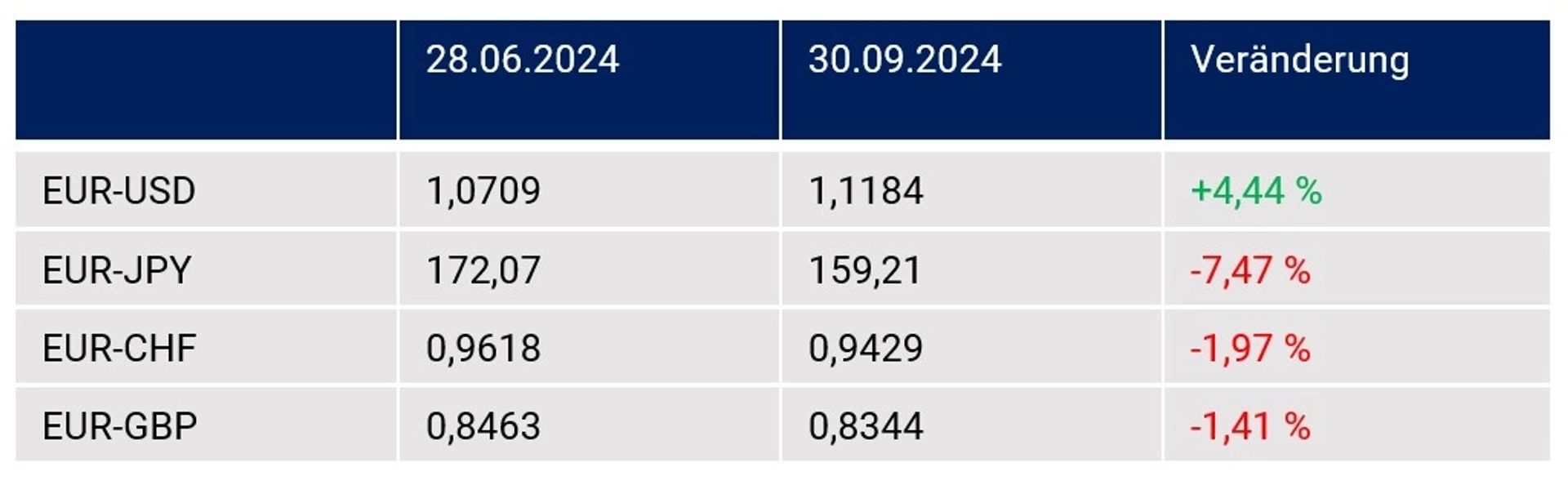 Das zu größten Teilen entspanntere Inflationsszenario insbesondere in der westlichen Welt wirkte sich nahezu durchgehend unterstützend für die Rentenmärkte aus. So wurden die Renditespitzen für 10-jährige US-Staatspapiere am 1. Juli mit 4,49 % markiert. Die tiefste Rendite wurde am 16. September bei 3,62 % verzeichnet (Stand 30. September 3,76 %). Die 10-jährige Bundesanleihe markierte am 1. Juli mit 2,61 % den Renditehöchststand des Quartals, um dann einen Renditetiefststand am 11. September bei 2,09 % zu erreichen (Stand 30. September 2024 2,14 %).