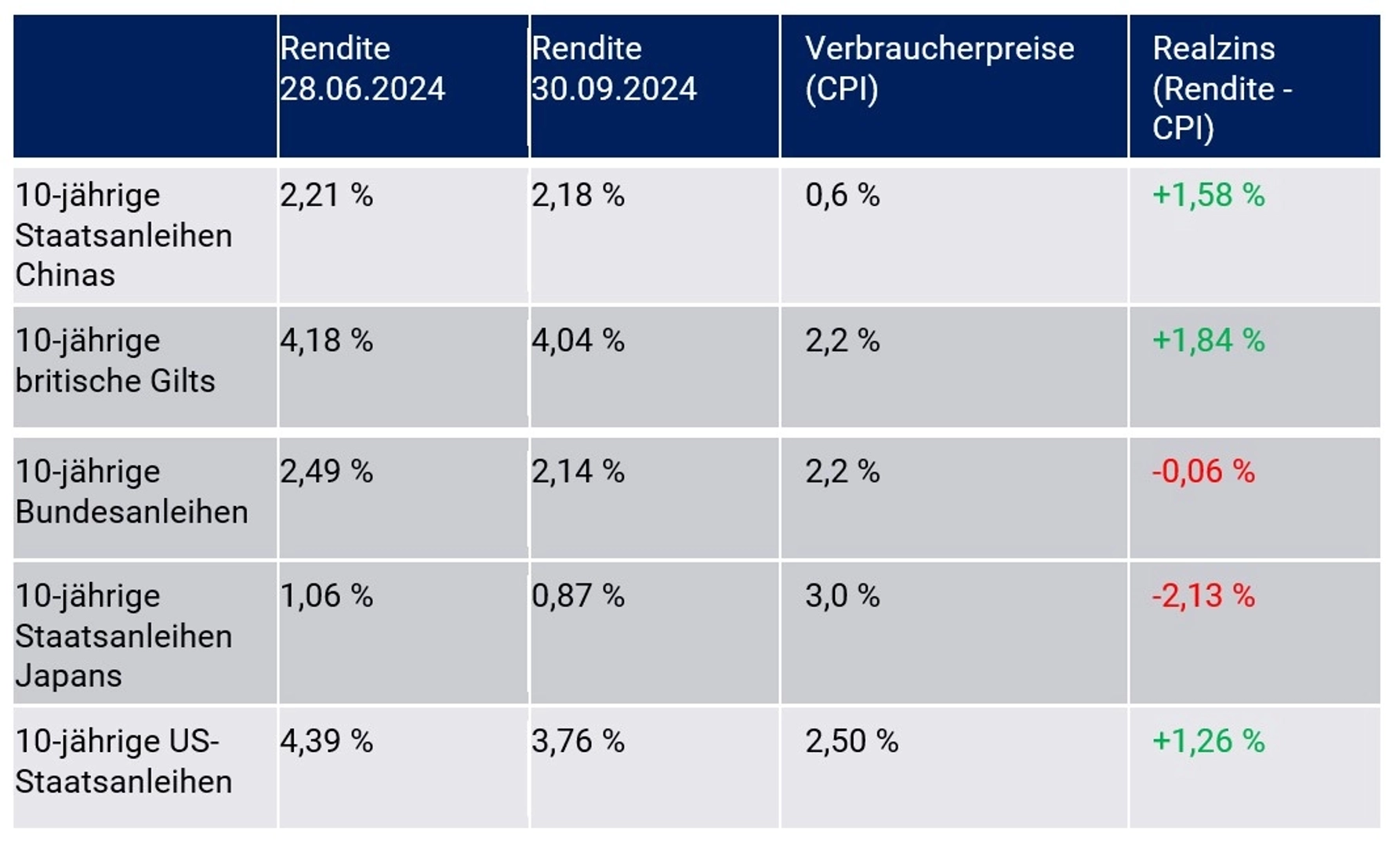 Im Quartalsvergleich kam es zu Rückgängen der Renditen in den USA (-0,63 %), in Deutschland (-0,35 %), in Großbritannien (-0,14 %), in Japan (-0,19 %) und in China (-0,03 %).