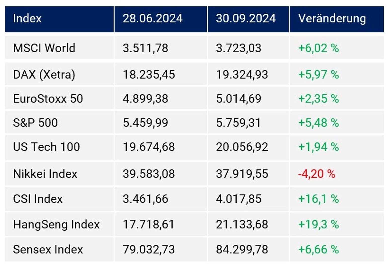 Das Sommerquartal reüssierte mit vielen neuen Rekordständen an den internationalen Aktienmärkten. Im Verlauf des Quartals wurden neue Kursrekorde im MSCI World, im DAX, im EuroStoxx 50, im S&P 500, im US Tech 100, im Nikkei und im Sensex markiert.